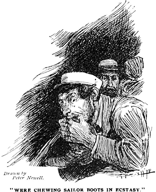An illustration from an 1898 issue of Cosmopolitan magazine. The caption reads: "Were chewing sailor boots in ecstasy."