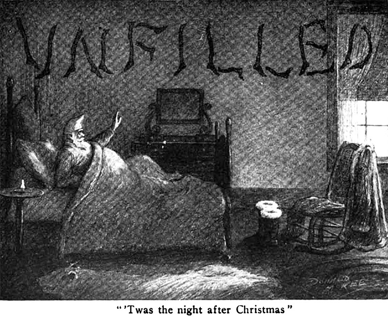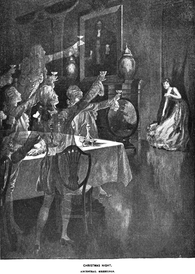 An illustration from a 1901 issue of Life magazine. The caption reads: "Christmas Night. Ancestral Greetings."