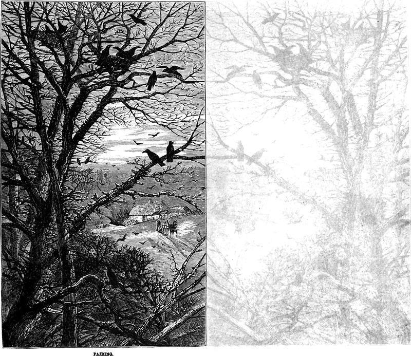 Bleeding ink and Google's scanning machine combine to form an aptly titled "Pairing." The illustration is from Peterson's magazine, 1877.