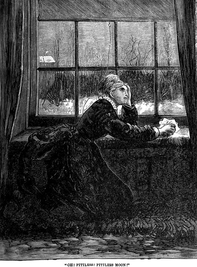 An illustration from an 1876 issue of Peterson's magazine. The caption reads: "Oh! Pitiless! Pitiless Moon!"