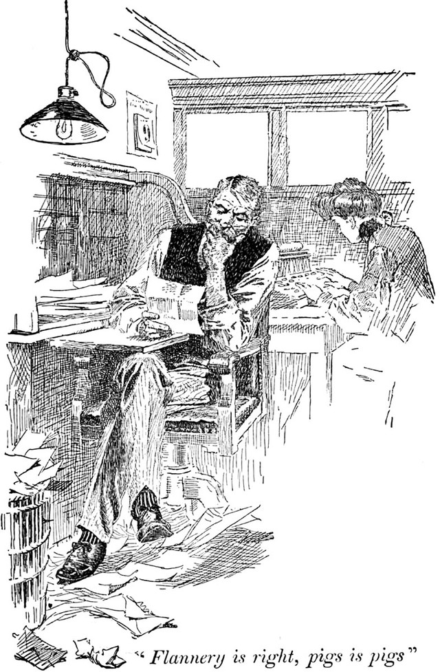 An illustration from Ellis Parker Butler, Pigs is Pigs (1905). The caption reads: "Flannery is right, pigs is pigs."