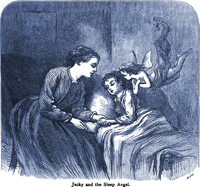 An illustration from Our Young Folks (1873). The caption reads: "Jacky and the Sleep Angel."