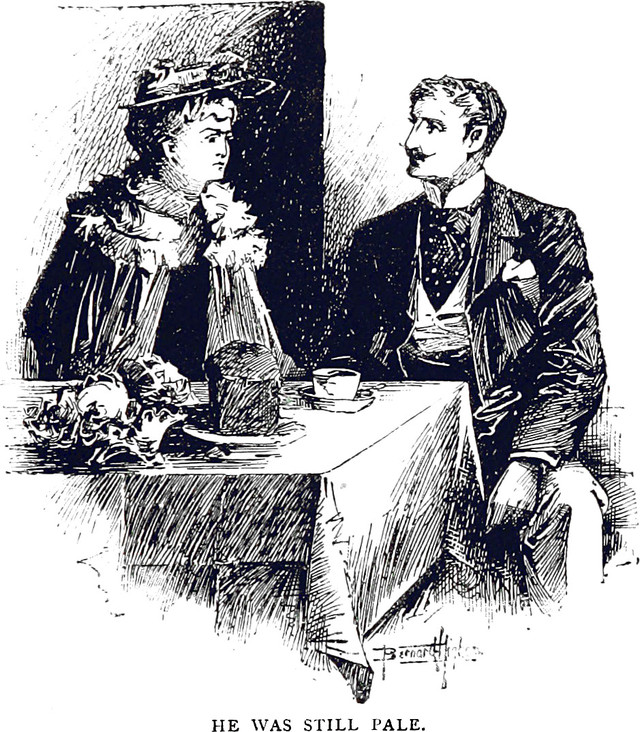 An illustration from The Experiences of Loveday Brooke, Lady Detective by Catharine Louisa Pirkis (1894). The caption reads: "He was still pale."