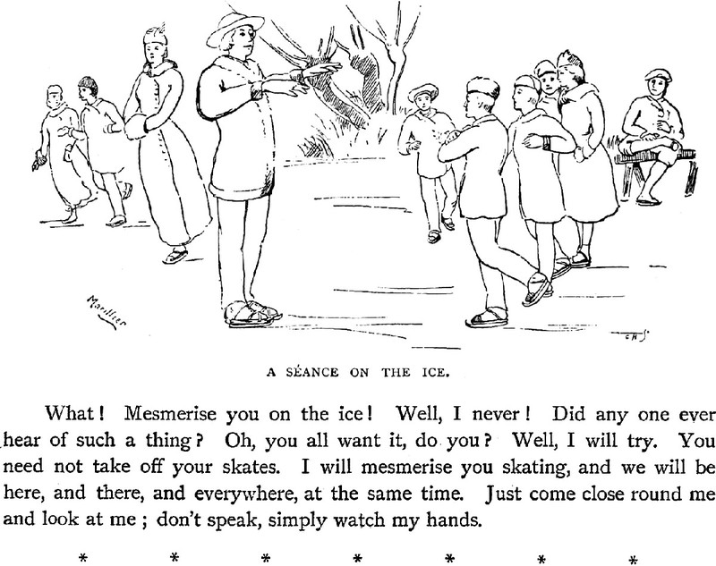 "A Séance on the Ice": an illustration from The Children's Fairy History of England by Forbes Edward Winslow (1889). The caption reads: "What! Mesmerise you on the ice! Well, I never! Did any one ever hear of such a thing? Oh, you all want it, do you? Well, I will try. You need not take off your skates. I will mesmerise you skating, and we will be here, and there, and everywhere, at the same time. Just come close round me and look at me; don't speak, simply watch my hands. * * * * * * *"