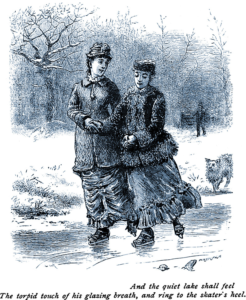 "And the quiet lake shall feel / The torpid touch of his glazing breath, and ring to the skater's heel." From Winter Pictures by Poet and Artist, engraved by Edward Whymper, 1881.