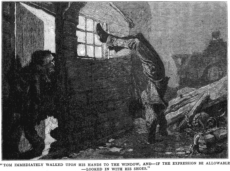 "Tom immediately walked upon his hands to the window, and—if the expression be allowable—looked in with his shoes." From The Works of Charles Dickens, Household Edition.