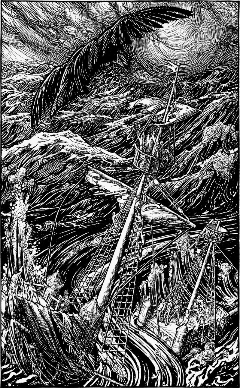 "A tongue of pale blue flame shivered on the truck of the mast," from Ia by Q. [A. T. Quiller-Couch], 1896.