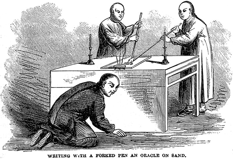 "Writing with a forked pen an oracle on sand," from Social Life of the Chinese by Justus Doolittle, 1867.