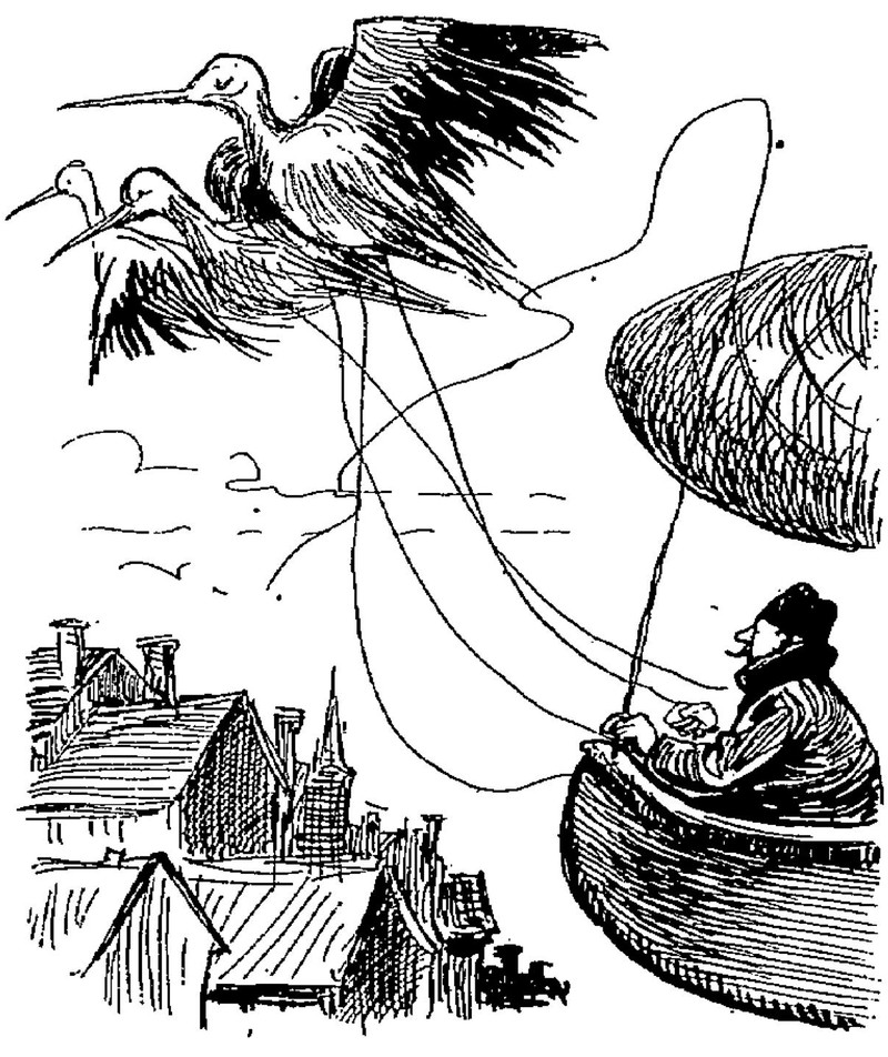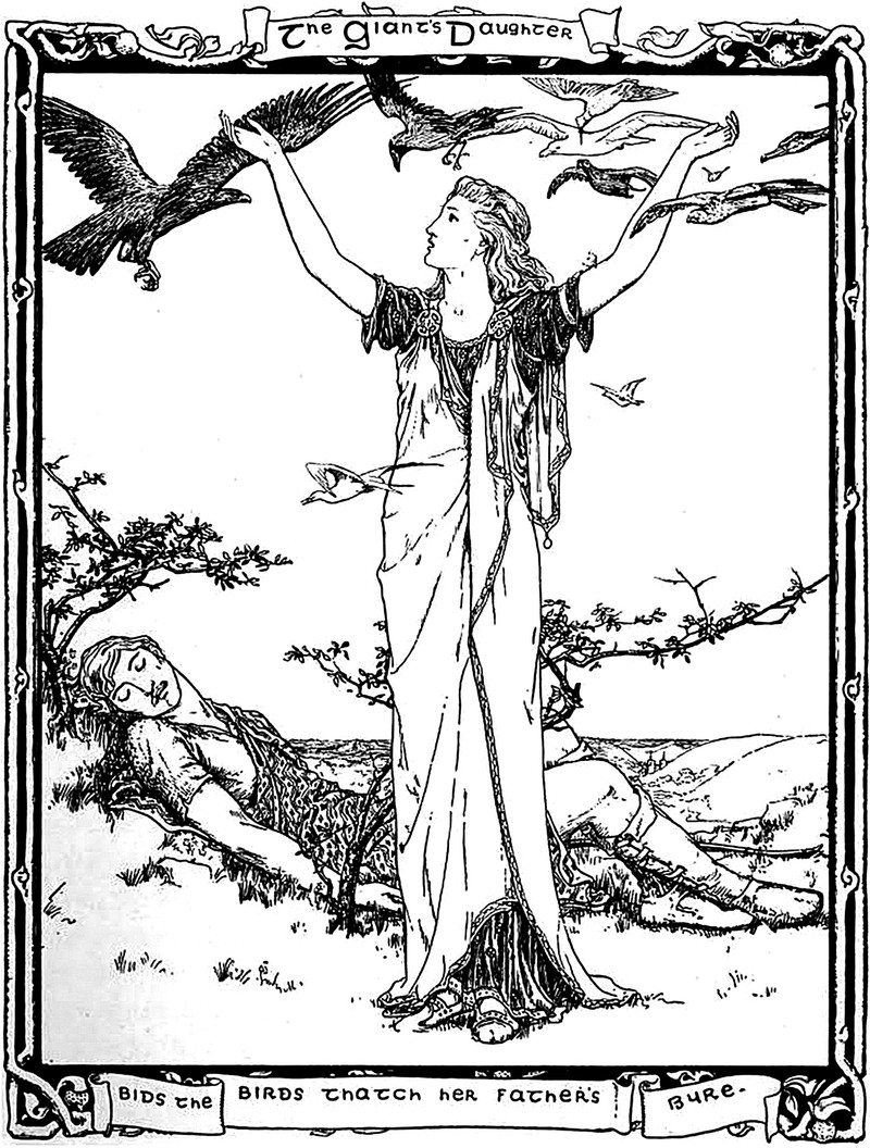 "The giant's daughter bids the birds thatch her father's byre." From Celtic Fairy Tales, selected by Joseph Jacobs and illustrated by John D. Batten, 1892.