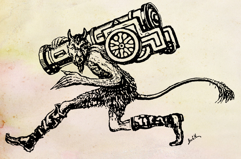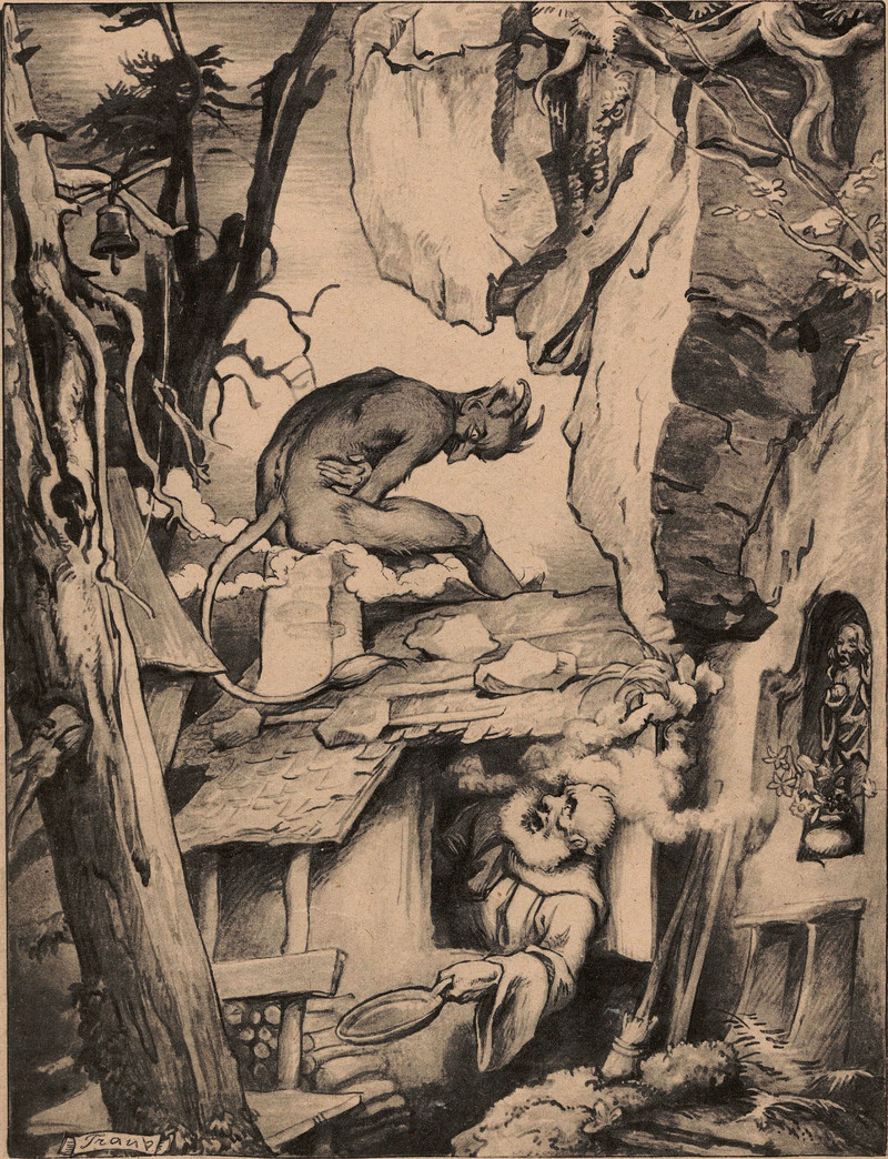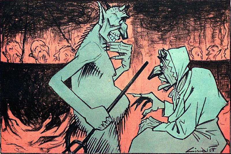 The devil skewers three demons with one arrow. From Zarnitsy, 1906.