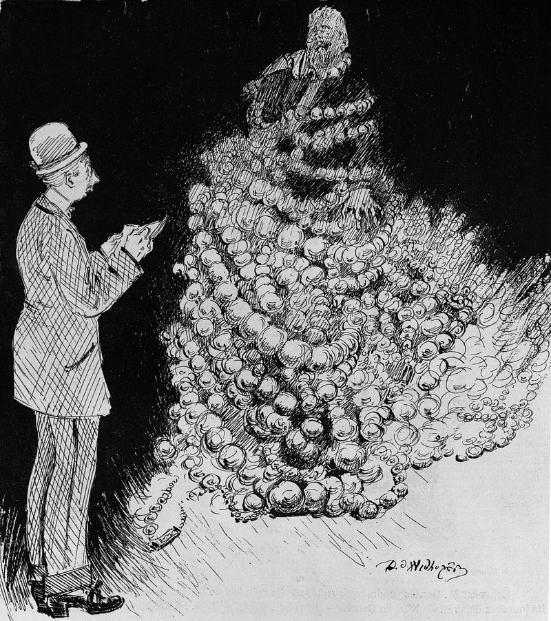 Bony fingers and skulls reflected in the eyeglasses. From Svobodnyi Smekh, 1905.