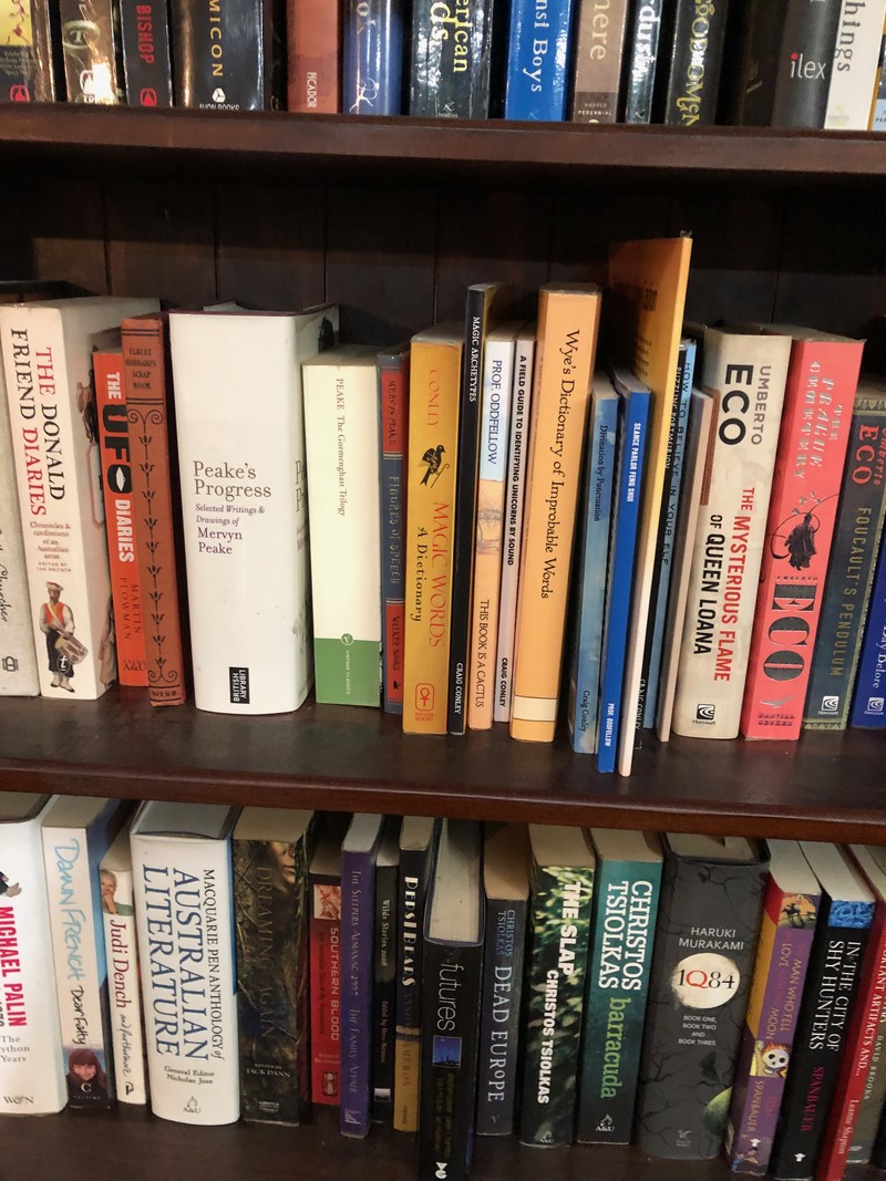 A retroactive lifetime goal, to be shelved between Umberto Eco and Mervyn Peake! A cherished reader shared this photo of the books of mine that he snagged: