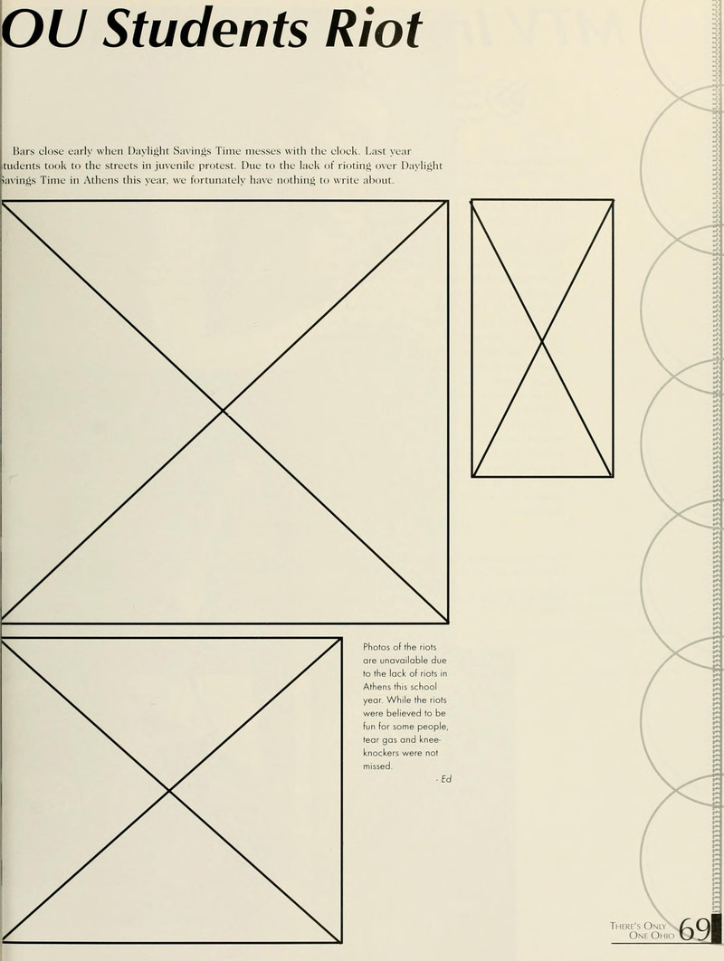 Non-photos of a riot that didn't take place. We don't know if a riot had so been expected that a yearbook page was mocked up, only to receive no photos in the end, or whether it's more artful than that. From Ohio's 1999 yearbook.