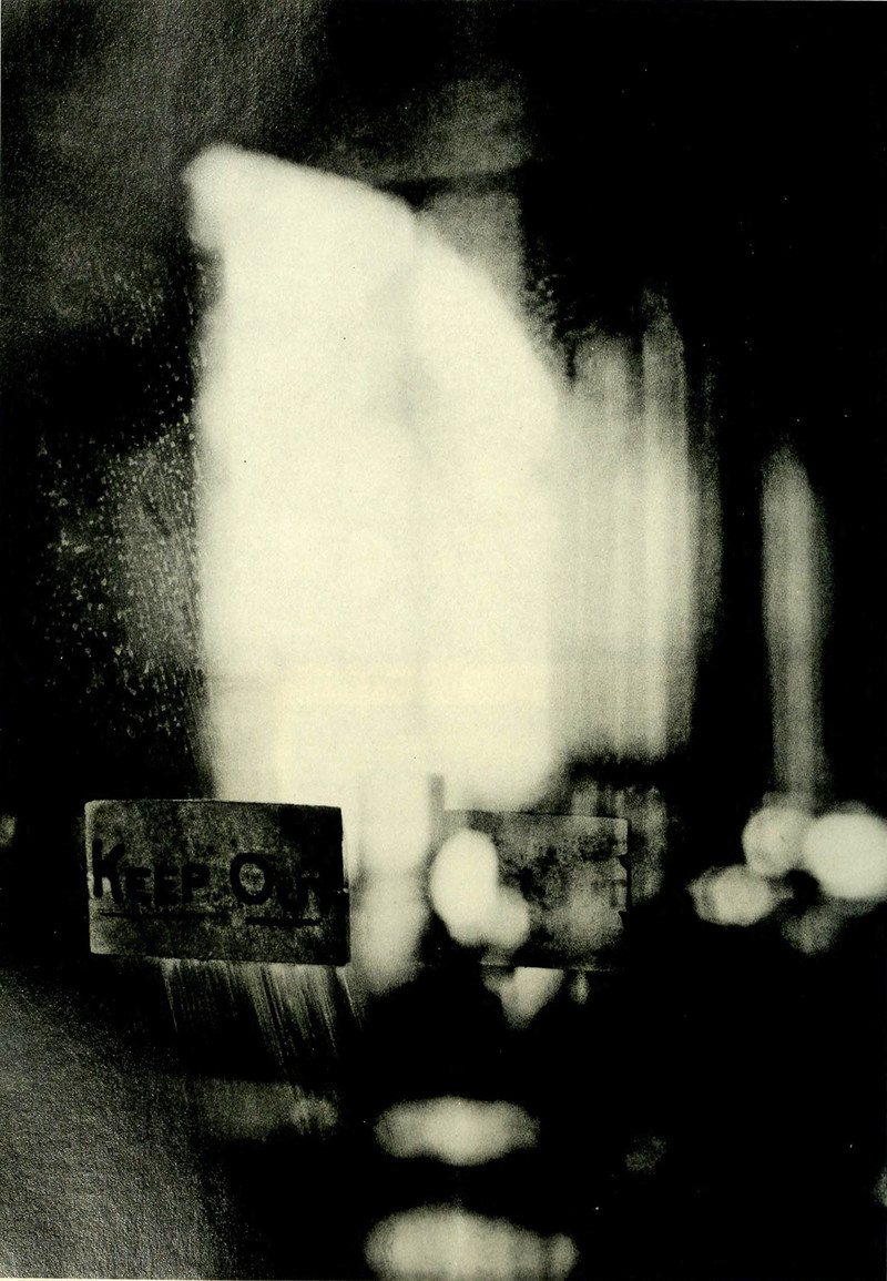 Compressed time: "A year's day-long has come to rest." This photograph's perspective is so foreshortened as to approach being superflat. It's somewhat cryptic, but ghostly car headlights are backing away from a wall on Lover's Lane in a long exposure. From Worcester's yearbook of 1963.
