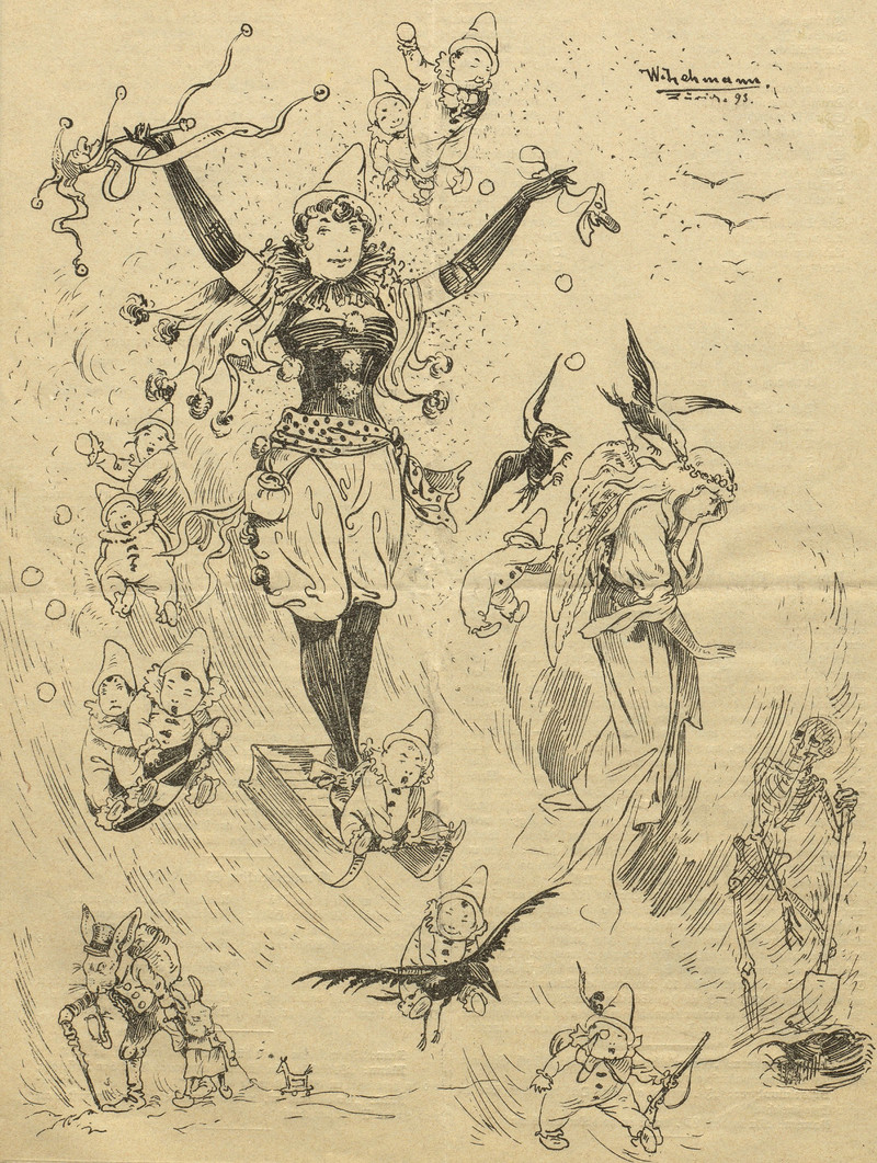 Every new year is a victim of "abandoned nest syndrome" and is left in the care of one clown or another. From Le Charivari, 1889.