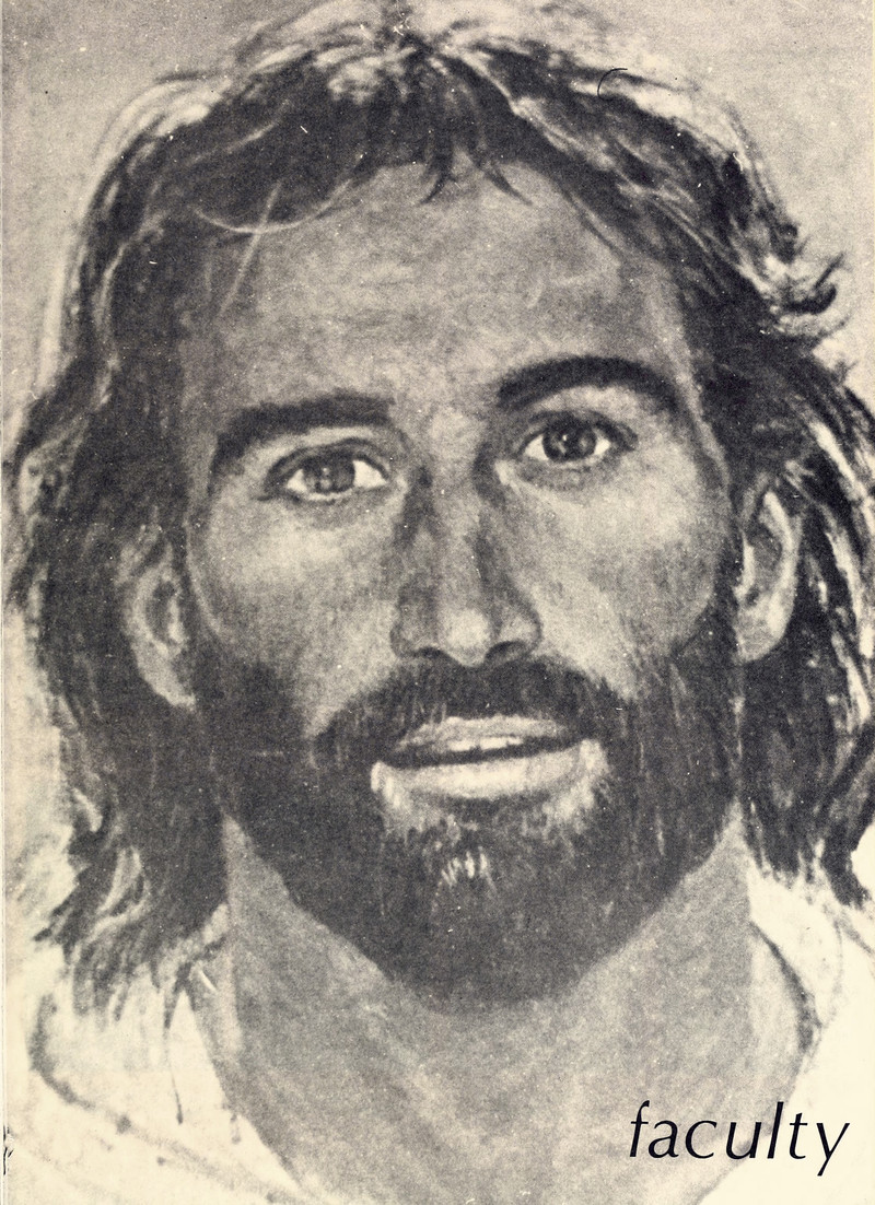 An X for a halo? Presumably it's the tail end of the ichthys symbol ("sign of the fish") of Christianity, but we've never before encountered it this way (we have gaps!) The red "64" sticker seems like a sun that Jesus is warding off. The sun and the Son. In mathematics, 64 is known as a " centered triangular number" (symbolic here of the Holy Trinity?) Of course, there are 64 demons in the Dictionnaire Infernal, and 64 hexagrams in the I Ching, and 64 squares on a chess board, so there are many (unsatisfactory) ways to interpret the cover of Sacred Heart's 1964 yearbook.