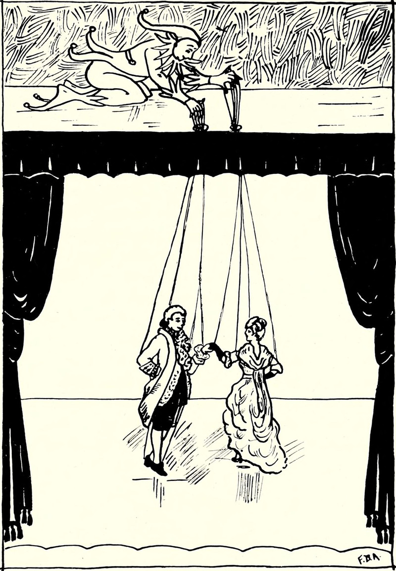 Here is the innermost chamber of the heart of the secret: we find our crucial material in old books of children's theatrical productions, full of time-honored, archetypal characters as well as illustrations (provided as guidance for costuming) and pithily-worded dialogue that, taken out of context, works rather amazingly as predictive aphorisms. Such books are freely available in the archives of virtual libraries, though a more exciting and providential method is to discover one in an antiquarian shop's dramaturgical corner.