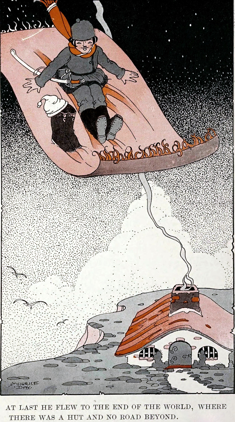 "At last he flew to the end of the world, where there was a hut and no road beyond." From Wonder Tales from Russia by Jeremiah Curtin, 1921.