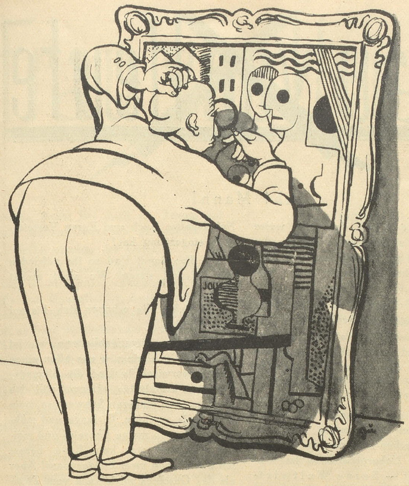 Upon closer examination, he realizes it isn't a Titian after all. From Nebelspalter, 1930.