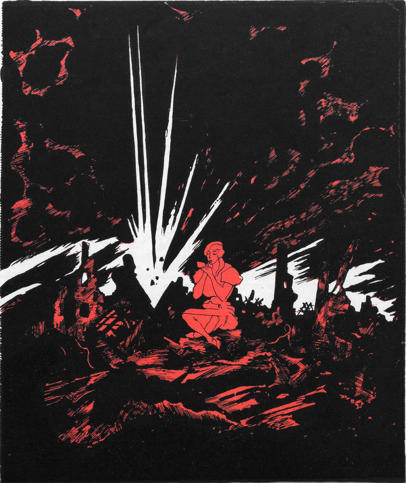 Applying lipstick as the world explodes. From Nebelspalter, 1933.