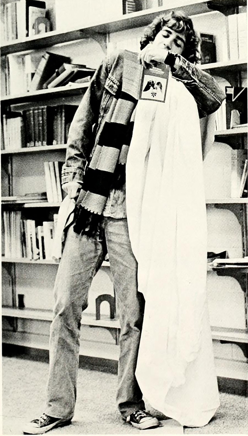 Encountering evil at the library. ( Here's the book with the wicked centerfold she's gasping at.) From Anderson's 1985 yearbook.