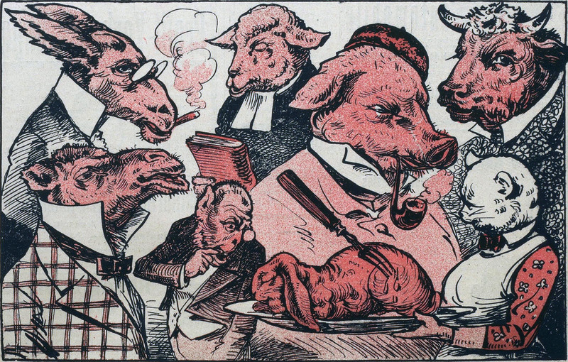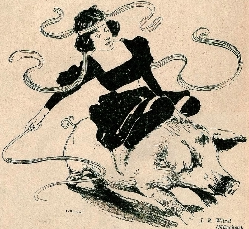 Pigs, too, worry about their weight, except that they seek to avoid slimming. From Der Guckkasten, 1909.