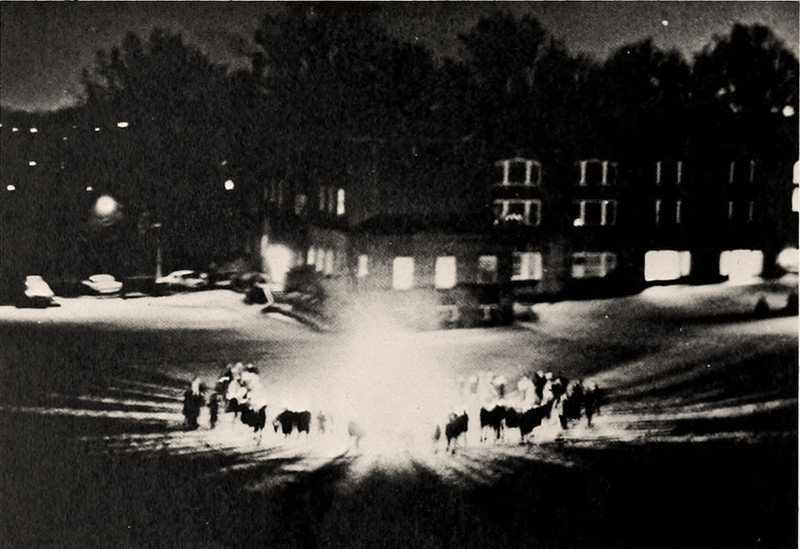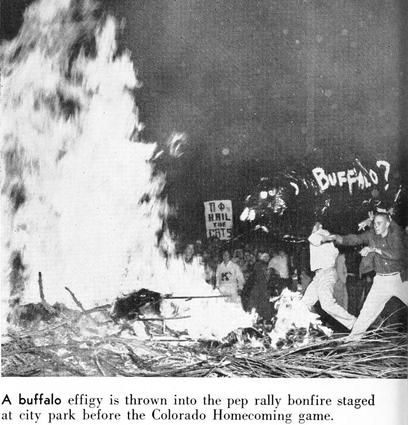 A questionable (complete with its own question mark) buffalo effigy. Now that buffalo effigies are endangered, they're less often thrown into bonfires. From Kanas State's 1958 yearbook.