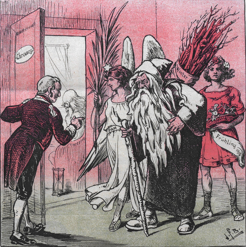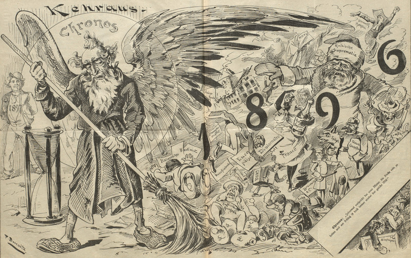 Chronos sweeps away the refuse of the old year. Today's marvels of automation make this easier. From Nebelspalter, 1897.