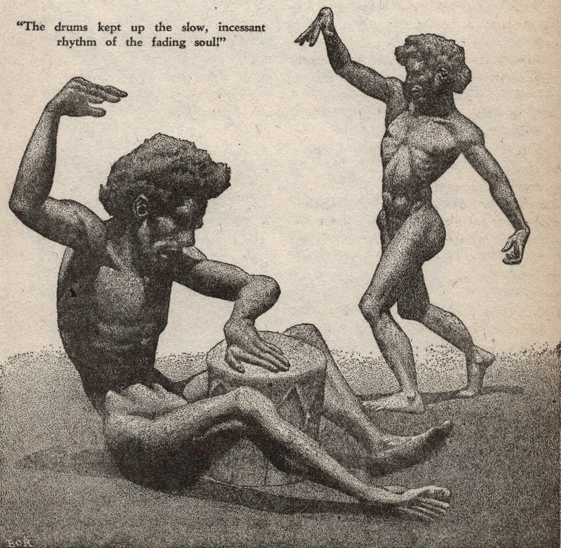 "The drums kept up the slow, incessant rhythm of the fading soul!" From Weird Tales, 1942.