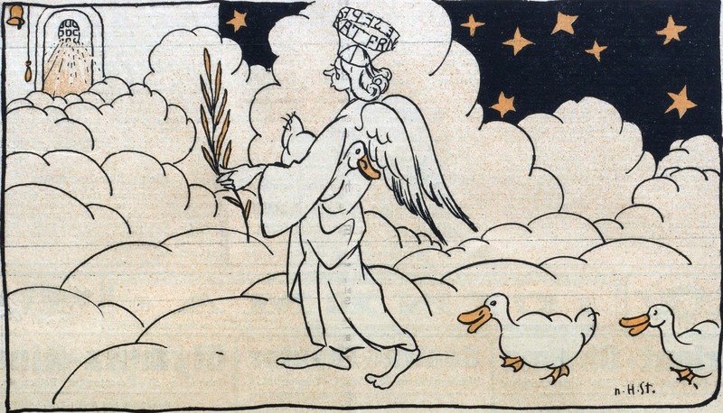 Rare to see the broom that the peace angel constructs out of those famous olive branches. From Nebelspalter, 1918.