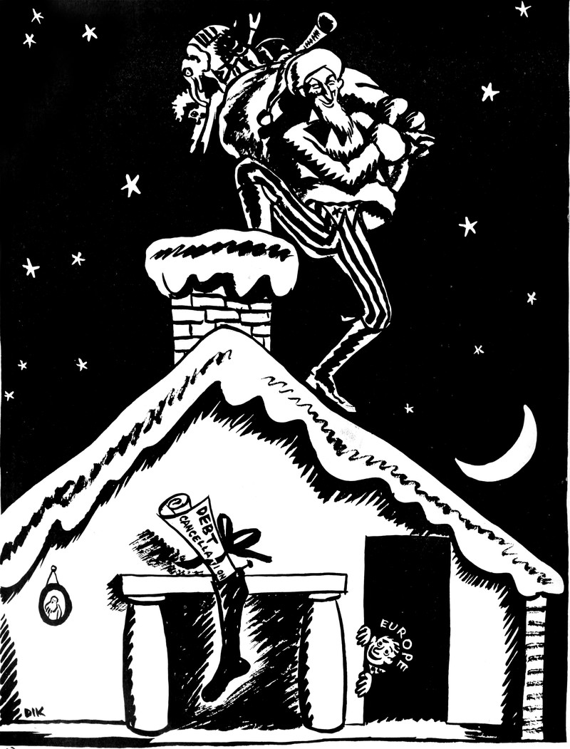 Italy is not a boot but rather a Christmas stocking that can be stuffed with other nations. From Nebelspalter, 1936.