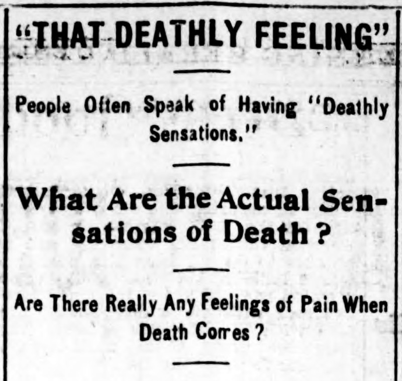 "'That deathly feeling.' People often speak of having 'deathly sensations.' What are the actual sensations of death? Are there really any feelings of pain when death comes?" From the Duluth Evening Herald, 1895.