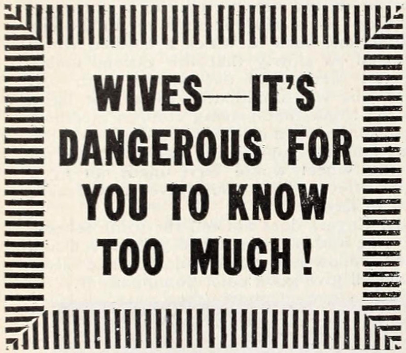"Wives -- it's dangerous for you to know too much!" From Moving Picture World, 1923.