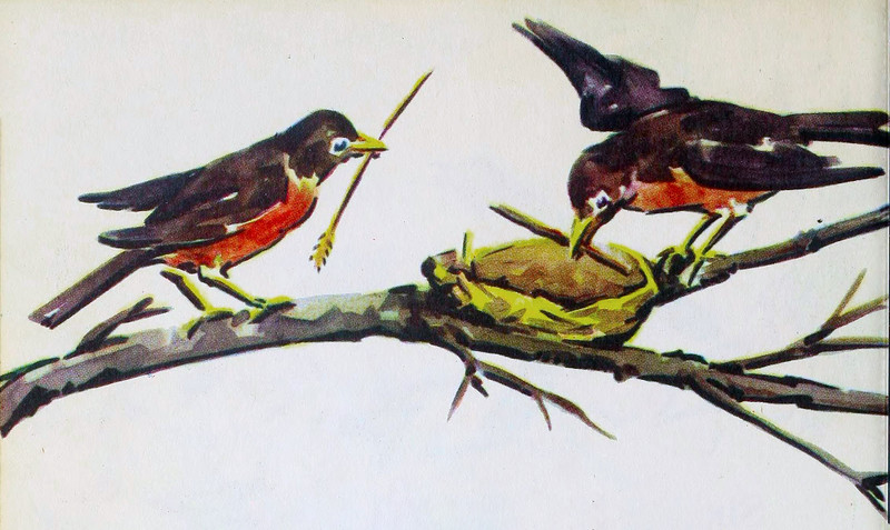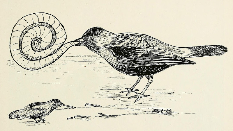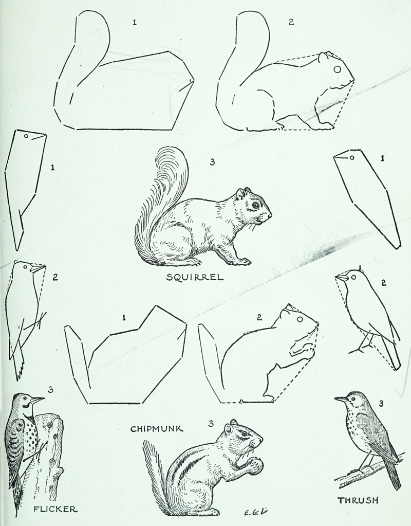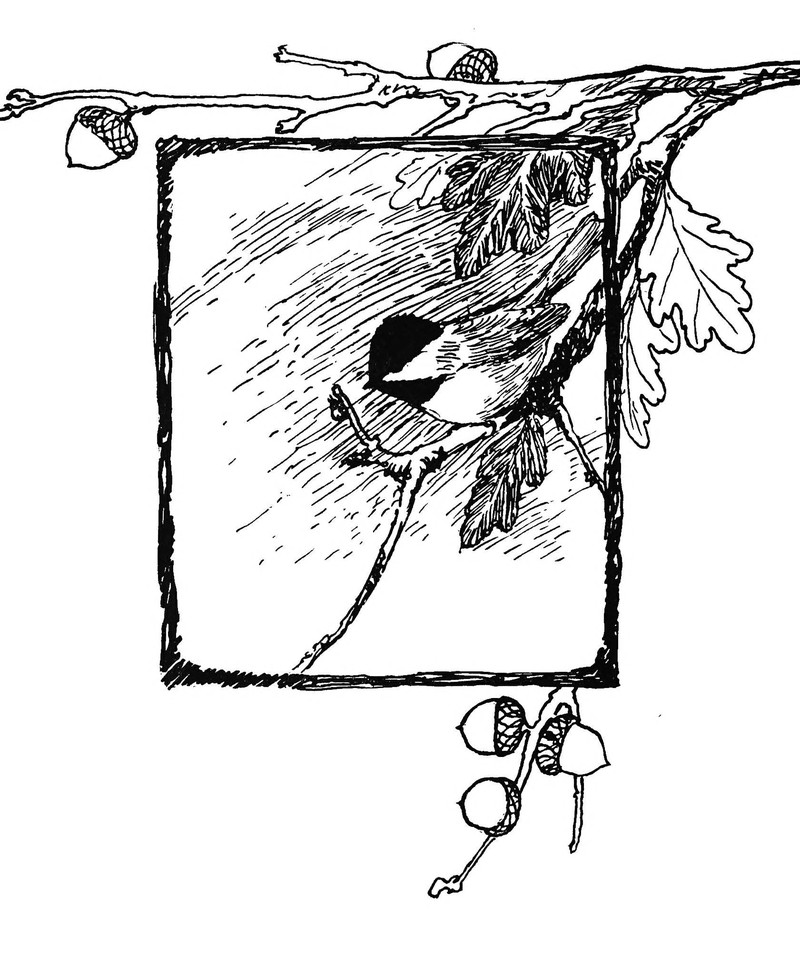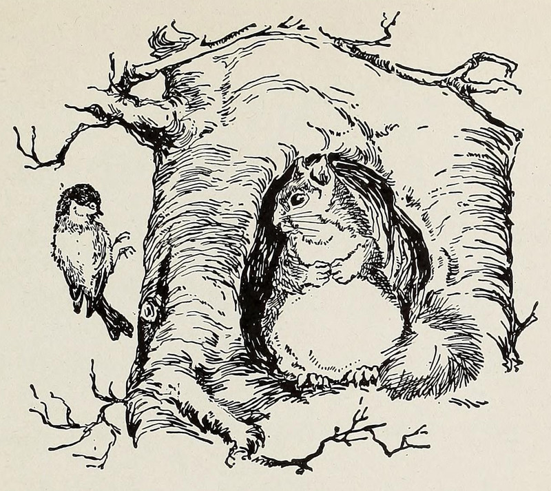 A black-capped chickadee and a squirrel. From The Outdoor Book by Zoe Meyer and illustrated by Clara E. Atwood, 1928.