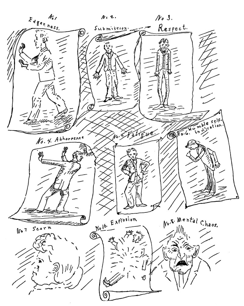 Tag your body language: Eagerness, Submission, Respect, Abhorrence, Fatigue, Humble self-indication, Scorn, Explosion, or Mental chaos. From Ohio University's 1892 yearbook.