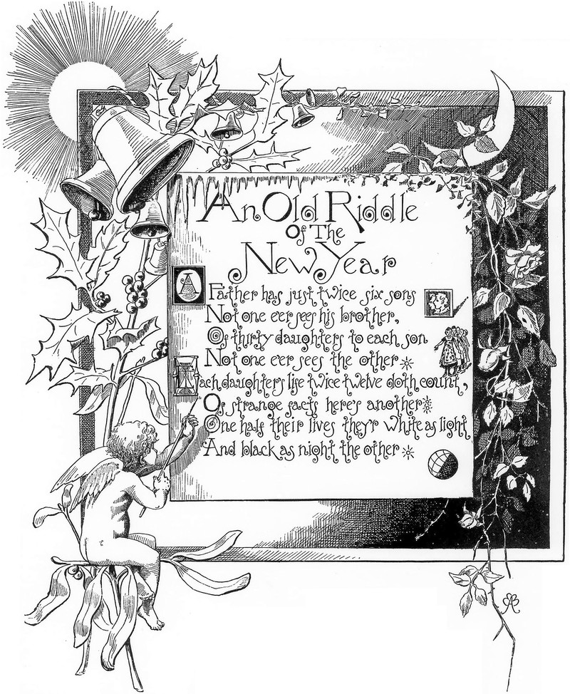 "An old riddle of the new year: A father has just twice six sons. Not one e’er sees his brother. Of thirty daughters to each son, not one e’er sees the other. Each daughter’s life twice twelve doth count. Of strange facts here’s another: One-half their lives they’re white as light, and black as night the other."