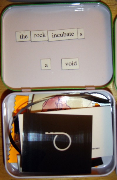 Mine has the poem: show the sausage/to a peach/sweaty white flood. Although the peaches and cream implication is, well, disgusting here, I like the poem above better. I particularly like the way "a void" is created between the words that could otherwise be read as avoid. Thus, I offer: