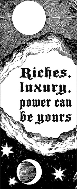 Answer: Diabolical. "Riches, luxury, power can be yours—soft beds and dainty foods. You can be great in the greatness that the world can see, famous with the fame your own ears will hear. Work for the world, and the world will pay you promptly; the wages the gods give are long delayed." —Jerome K. Jerome, Diary of a Pilgrimage, 2001, p. 194. (The answer is in black text on the black background. Highlight it to view.)