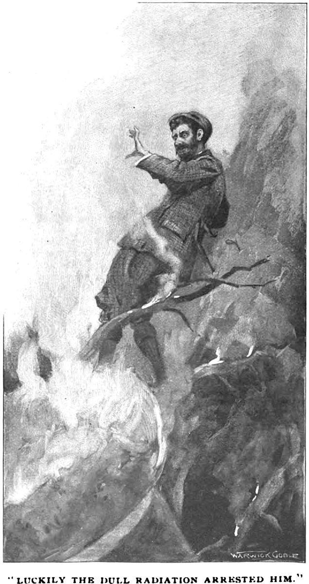 An illustration from an 1896 issue of Cosmopolitan magazine. The caption reads: "Luckily the dull radiation arrested him."