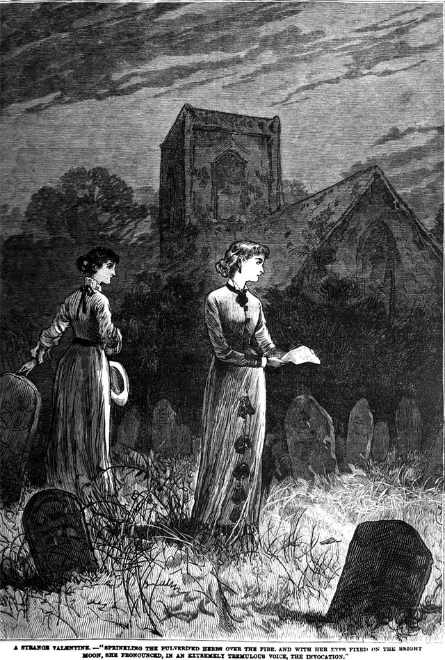 "A Strange Valentine": an illustration from an 1883 issue of Frank Leslie's Popular Monthly magazine. The caption reads: "Sprinkling the pulverized herbs over the fire, and with her eyes fixed on the bright moon, she pronounced, in an extremely tremulous voice, the invocation."