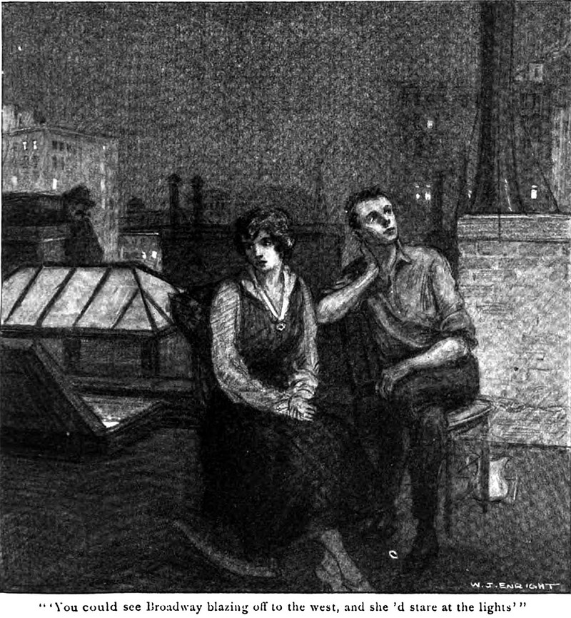 An illustration from a 1916 issue of Century Illustrated magazine. The caption reads: "You could see Broadway blazing off to the west, and she'd stare at the lights."