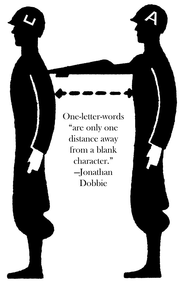 The caption reads, "One-letter-words 'are only one distance away from a blank character.' —Jonathan Dobbie."