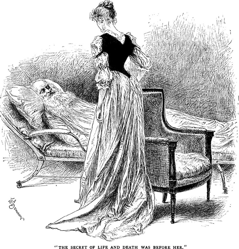 An illustration from an 1890 issue of English Illustrated magazine. The caption reads: "The secret of life and death was before her."