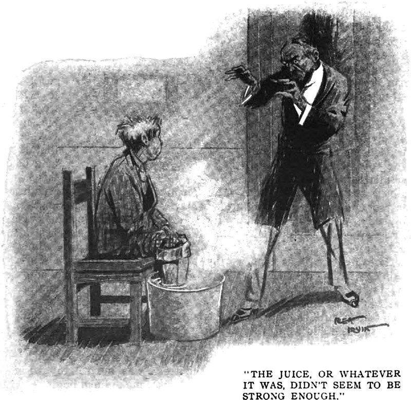 An illustration from a 1909 issue of Hampton's magazine. The caption reads: "Engaged, evidently, in weaving a tale of magic."