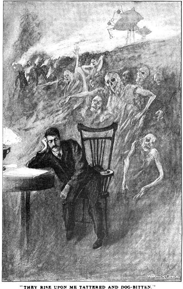 An illustration from an 1897 issue of Cosmopolitan magazine. The caption reads: "They rise upon me tattered and dog-bitten."