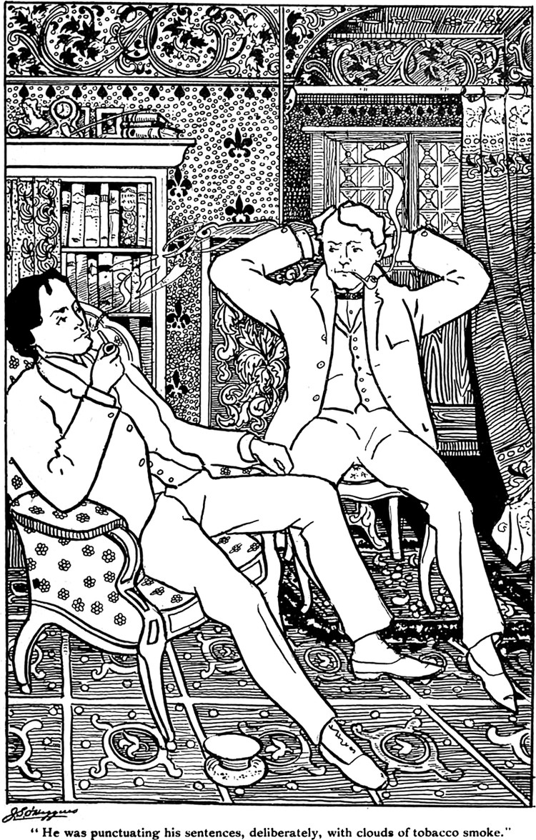 An illustration from The Canadian Magazine, 1897. The caption reads, "He was punctuating his sentences, deliberately, with clouds of tobacco smoke."