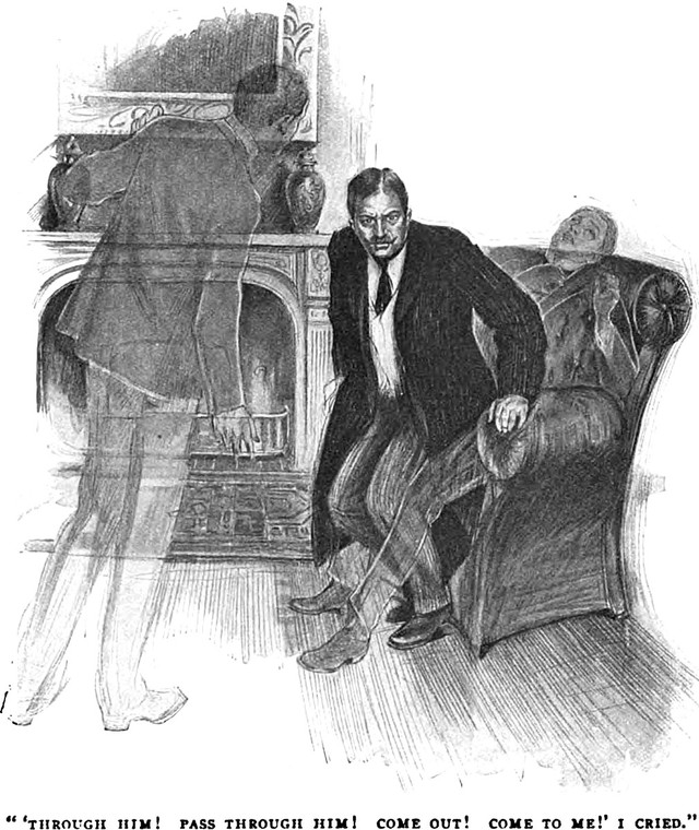 An illustration from a 1904 issue of Metropolitan magazine. The caption reads: "'Through him! Pass through him! Come out! Come to me!' I cried."