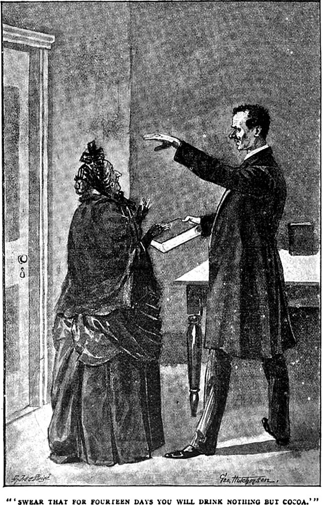 An illustration from an 1895 issue of The Idler magazine. The caption reads: "Swear that for fourteen days you will drink nothing but cocoa."