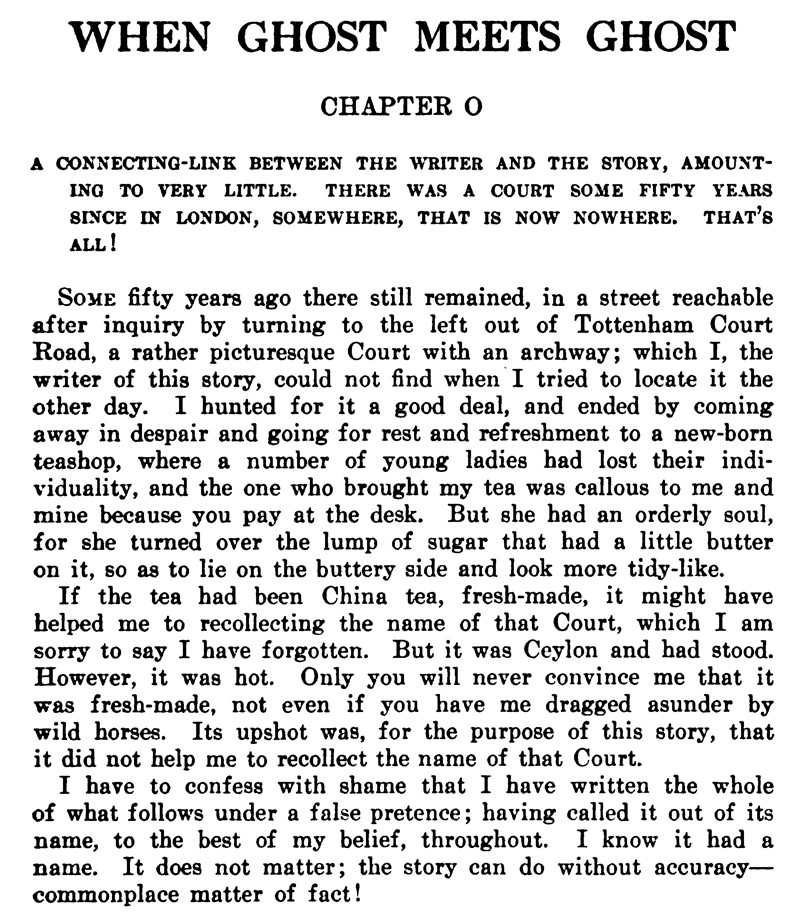 There's so much to love in this first page of William De Morgan's When Ghost Meets Ghost (1914). The first chapter is very rightly numbered zero. Shouldn't all ghost stories begin with chapter zero? The chapter summary is playfully honest about what it amounts to, and it mentions a "somewhere that is now nowhere." In the first paragraph, there's a withering mention of several young ladies having "lost their individuality." The third paragraph exposes a great truth: a story can do without accuracy.