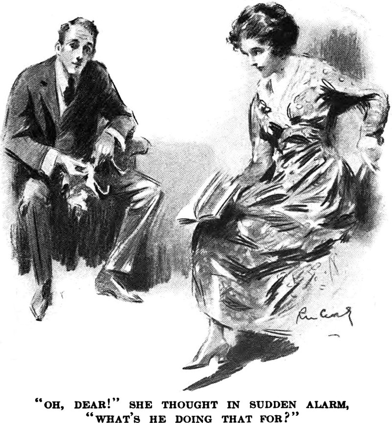 An illustration from Oh Mary, Be Careful! by George Weston (1917). The caption reads: "'Oh, dear!' she thought in sudden alarm, 'what's he doing that for?'"